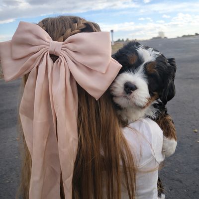 We are absolutely thrilled to breed the newest Ultra Bernedoodles! By breeding a Bernese Mountain Dog (BMD) with a Bernedoodle we get remarkable puppies who maintain the beloved hypoallergenic and low-shedding features associated with Bernedoodles, while offering the loyalty, calm demeanor, and intelligence of the BMD. Our Ultra Bernedoodles are 75% BMD and are raised to be deeply human-connected, easygoing, and incredibly smart...perfect for families and individuals alike.